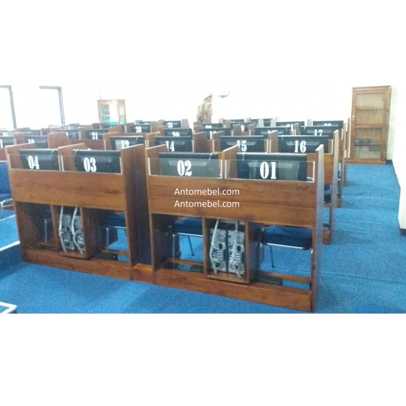Meja Lab Komputer yang kami buat berbahan kayu jati, bisa juga dibuat dengan bahan kayu lainnya spt kayu mahoni. Walaupun beda bahan baku, meja lab bahasa tetap memiliki spesifikasi dan kontruksi yang sama. Sehingga tetap kokoh, mengenai durabilitas atau keawetan atau lifespan meja tsb ditentukan oleh Jenis Kayu. Tetapi dibandingkan dengan triplek, produk dari kayu cenderung lebih tahan lama, terutama tahan terhadap air dan goncangan. Sambungan lebih kokoh, lem dan sekrup pada kayu juga lebih optimal bisa diterapkan.
