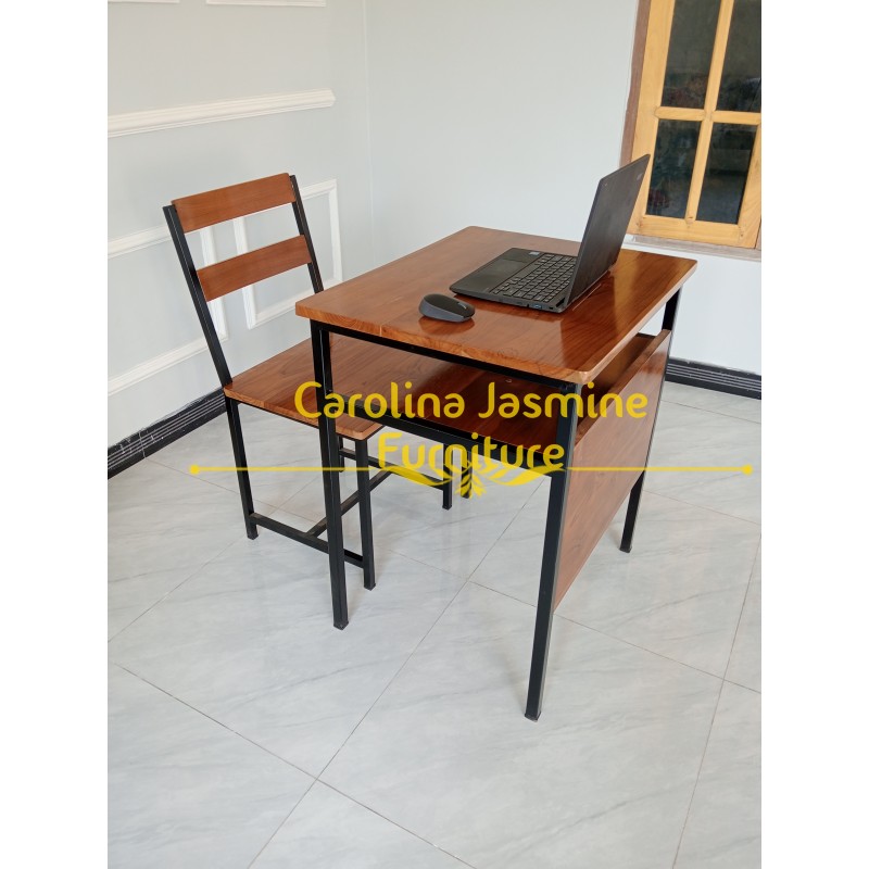 Finishing meja kursi dengan melamine natural. Besi dengan cat duco hitam sehingga tahan karat.